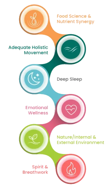 We reshape lifestyles through our six pillars: Deep Cellular Nutrition, Adequate Exercise, Quality Sleep, Emotional Wellness, Reconnecting with the Spirit and Breath.